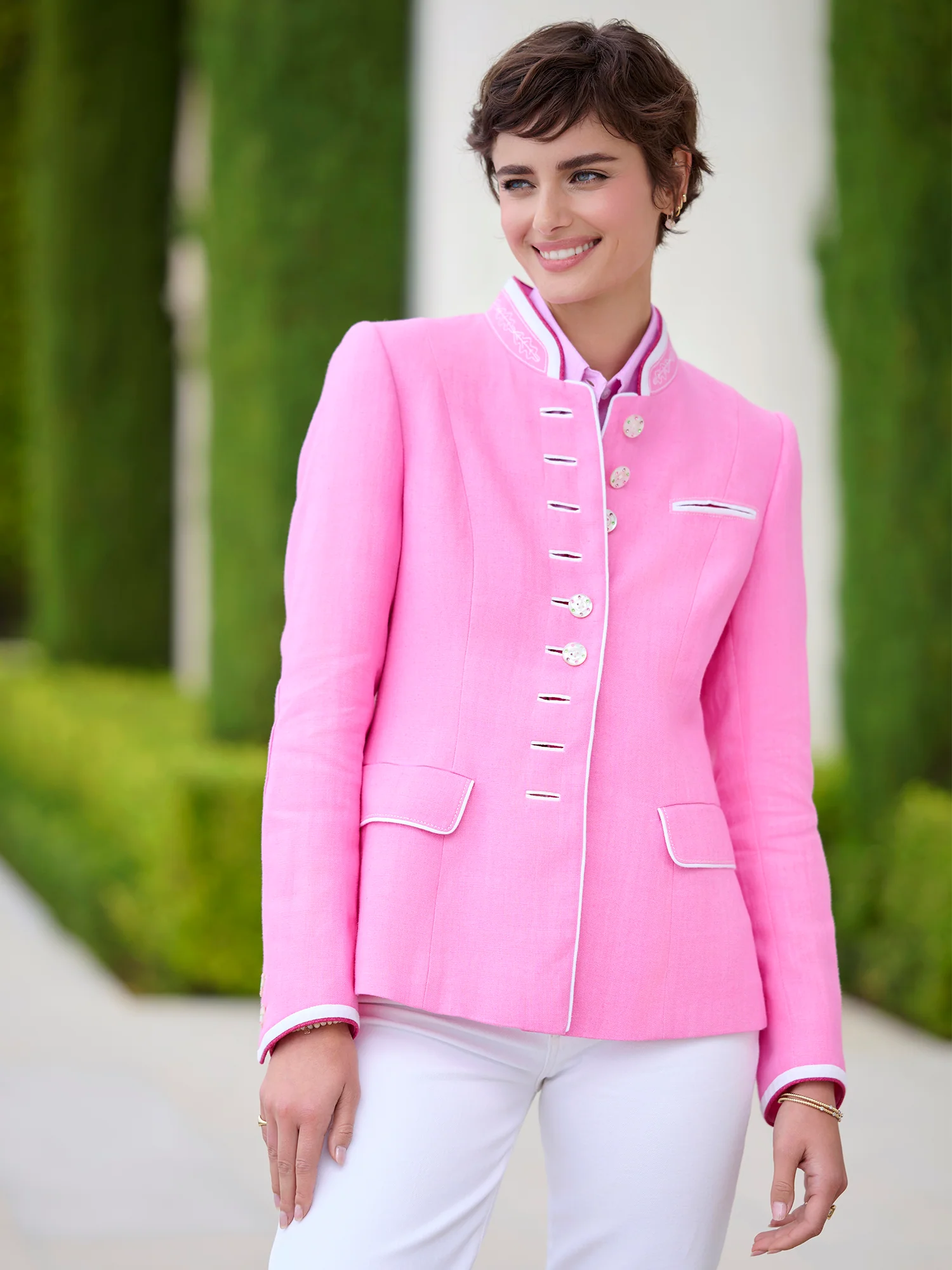 A timeless classic exuding luxury and refinement, the Alt Aussee Linen Jacket elevates your style with contemporary elegance. Contrast piping, embroidered details, and a crystal button closure add visual interest to the classic design, while a back pleat, belt, and three pockets provide sophisticated practicality. Expertly crafted in Austria, the jacket offers refined versatility and sophisticated craftsmanship.
