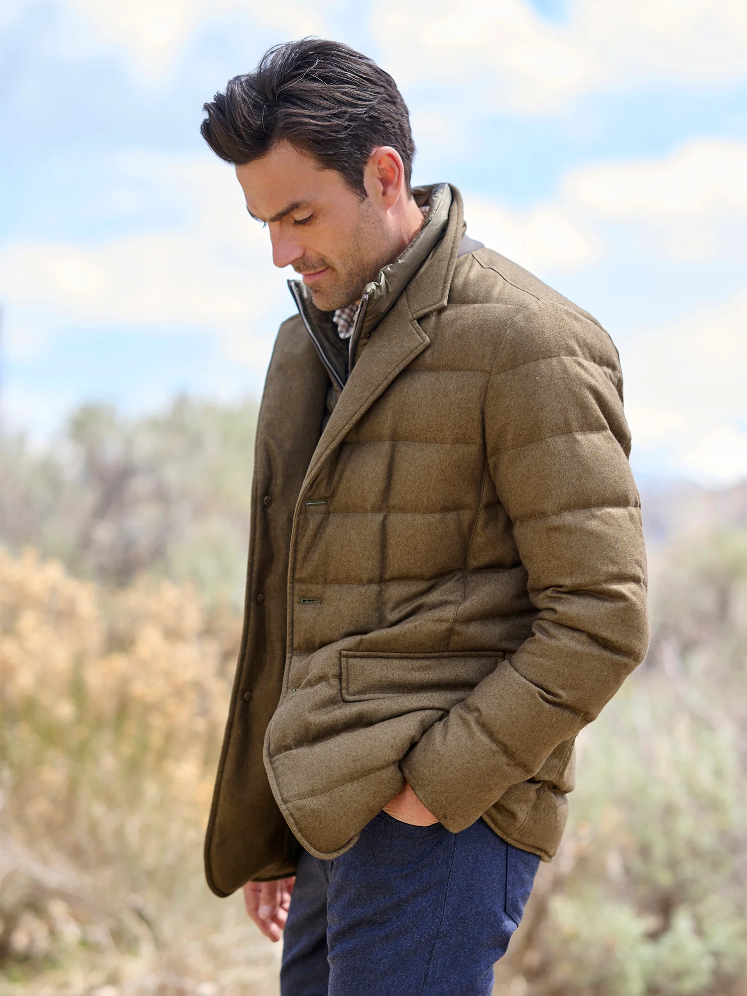 Discover the Conor Cashmere Silk Down Blazer by Herno. This sporty blazer is crafted from a quilted, water-repellent cashmere and silk blend and insulated with ultra-light down insulation. The removable wind guard offers additional protection from the elements and warmth for the extra cool days.