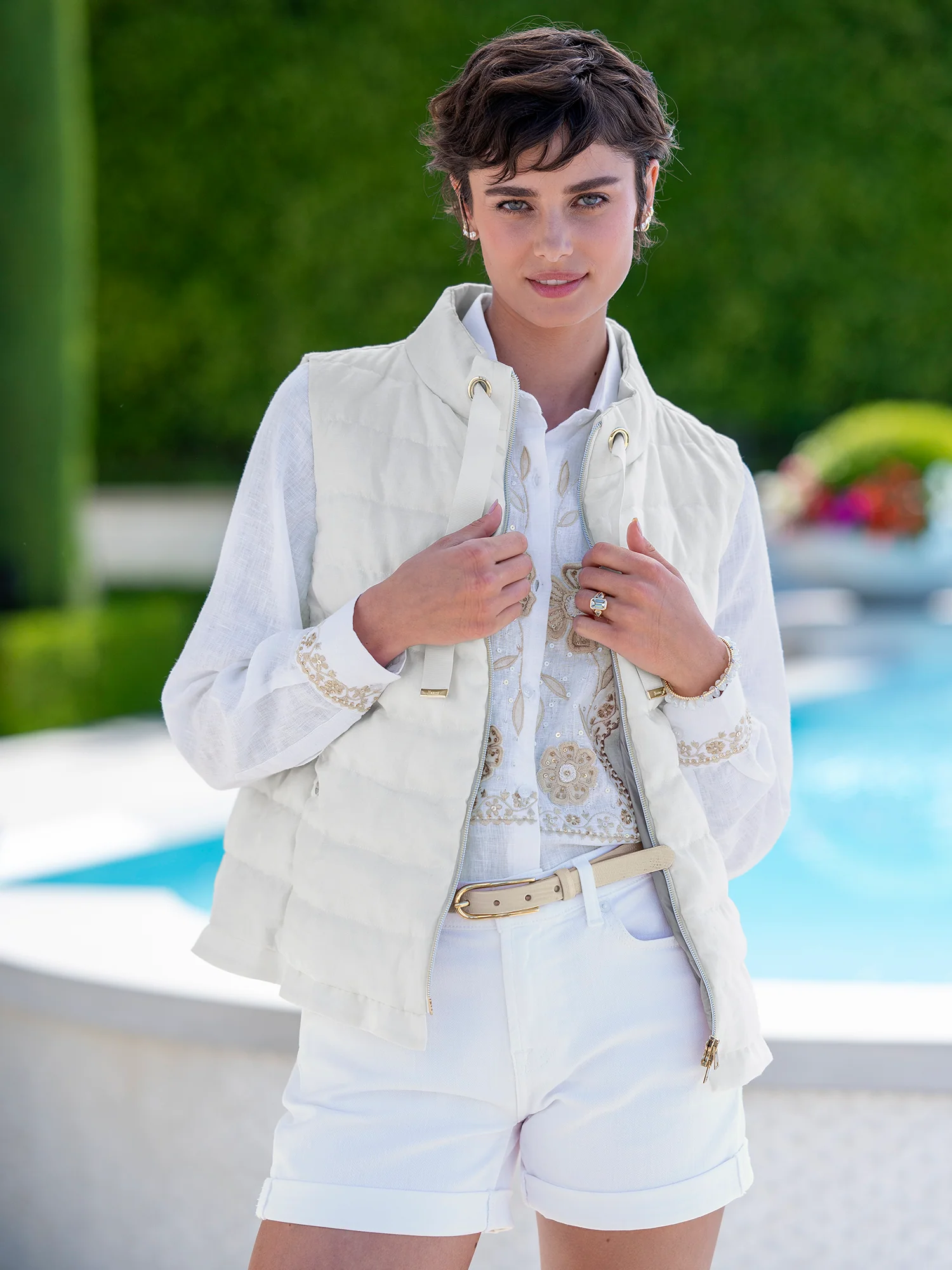 The Krista Vest by Herno is made from linen and filled with down insulation for warmth. The ruffle hem adds a feminine touch, while the stand collar with grosgrain ribbon drawstrings enhances its design. A chic layering piece that offers a modern, refined look.