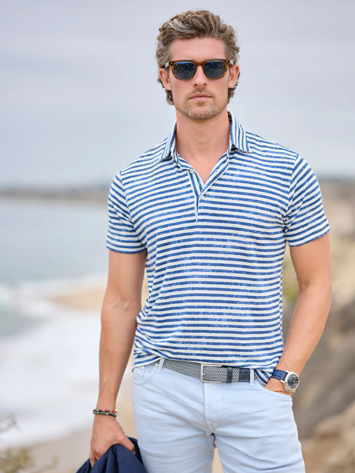 Crafted from breathable linen jersey with subtle stretch, this polo shirt combines comfort with refined style. The distressed stripe pattern adds visual interest and an effortlessly polished aesthetic. Perfect for warm-weather dressing, it transitions seamlessly from casual weekends to relaxed professional settings.