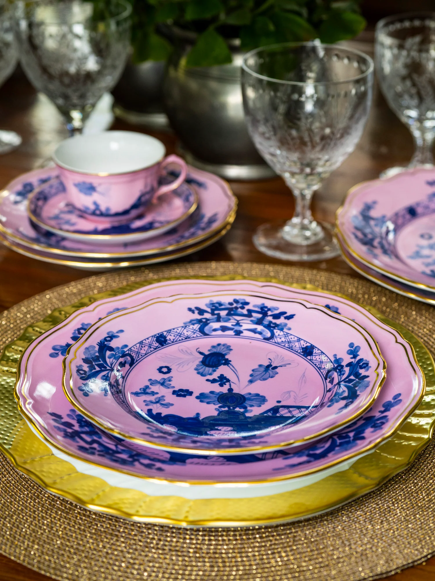 Enjoy a bright and colorful tea service with this matching cup and saucer set by Richard Ginori. The hand-painted azalea color is accentuated by signature gold threading and the brand's iconic carnation motif in blue. Evoke a magical garden party with the Oriente Italiano collection, a showcase of traditional Italian craftsmanship.